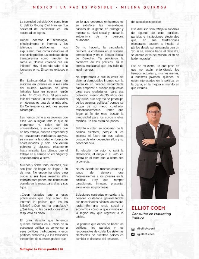 El gran desafío que tenemos quienes estamos en el oficio de la estrategia política es convencer a esos políticos tradicionales, a esos partidos históricos y a los tribunales electorales de nuestros países que, en lo que debemos enfocarnos es en satisfacer las necesidades básicas de la gente, en proteger y mejorar su nivel social y, cuidar la autoestima de la persona ciudadana.