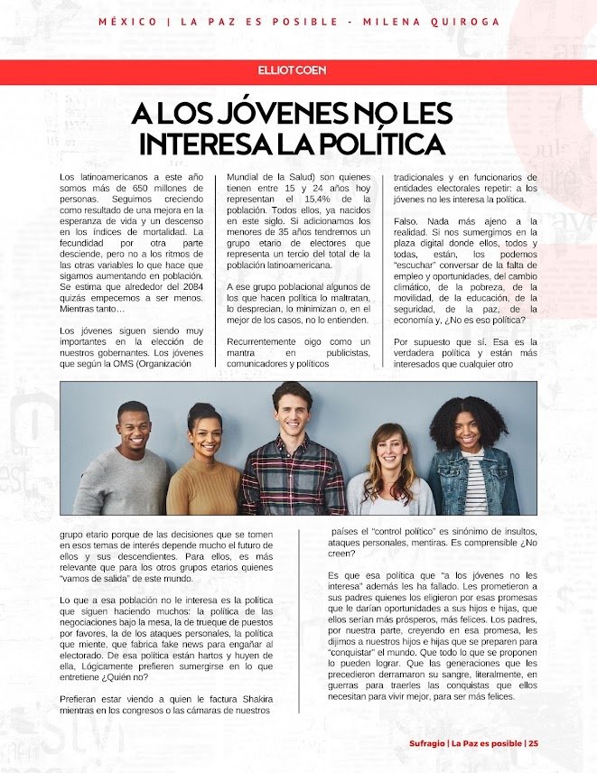 Falso. Nada más ajeno a la realidad. Si nos sumergimos en la plaza digital donde ellos, todos y todas, están, los podemos “escuchar” conversar de la falta de empleo y oportunidades, del cambio climático, de la pobreza, de la movilidad, de la educación, de la seguridad, de la paz, de la economía y, ¿No es eso política?