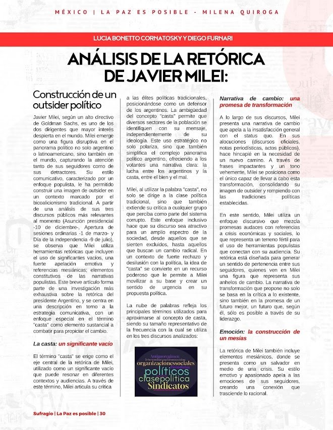 Construcción de un outsider político Javier Milei, según un alto directivo de Goldman Sachs, es uno de los dos dirigentes que mayor interés despierta en el mundo. Milei emerge como una figura disruptiva en el panorama político no solo argentino o latinoamericano, sino también en el mundo, capturando la atención tanto de sus seguidores como de sus detractores. Su estilo comunicativo, caracterizado por un enfoque populista, le ha permitido construir una imagen de outsider en un contexto marcado por el bicoalicionismo tradicional. A partir de una análisis de sus tres discursos públicos más relevantes al momento (Asunción presidencial -10 de diciembre, Apertura de sesiones ordinarias 1 de marzo- y Dia de la independencia -9 de julio). se observa que Milei utiliza herramientas retóricas que incluyen el uso de significantes vacíos, una fuerte apelación emotiva y referencias mesiánicas: elementos constitutivos de las narrativas populistas. Este breve articulo forma parte de una investigación más exhaustiva sobre la retórica del presidente Argentino, y se centra en una descripción en tomo a la estrategia comunicativa, con un enfoque especial en el término “casta como elemento sustancial a combatir para propiciar el cambio.