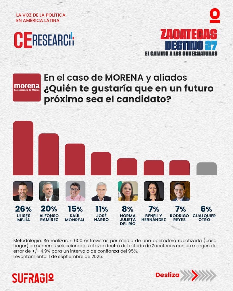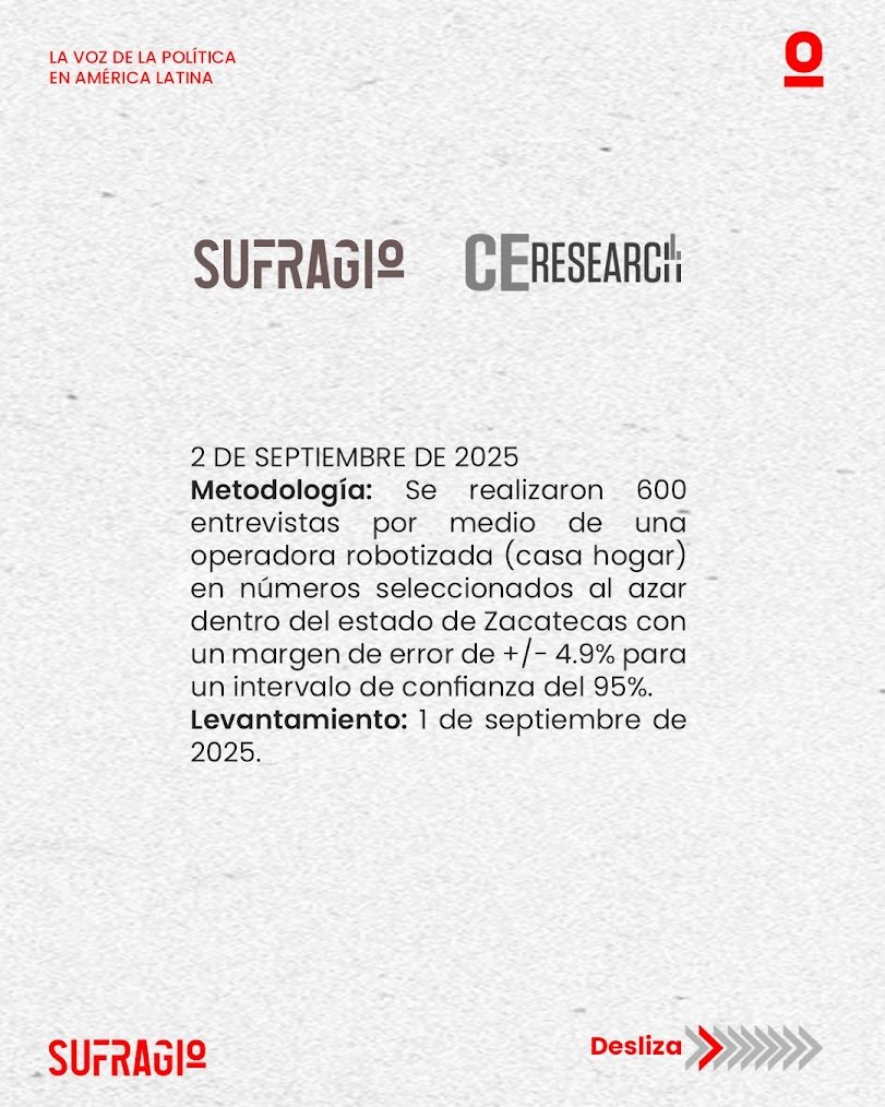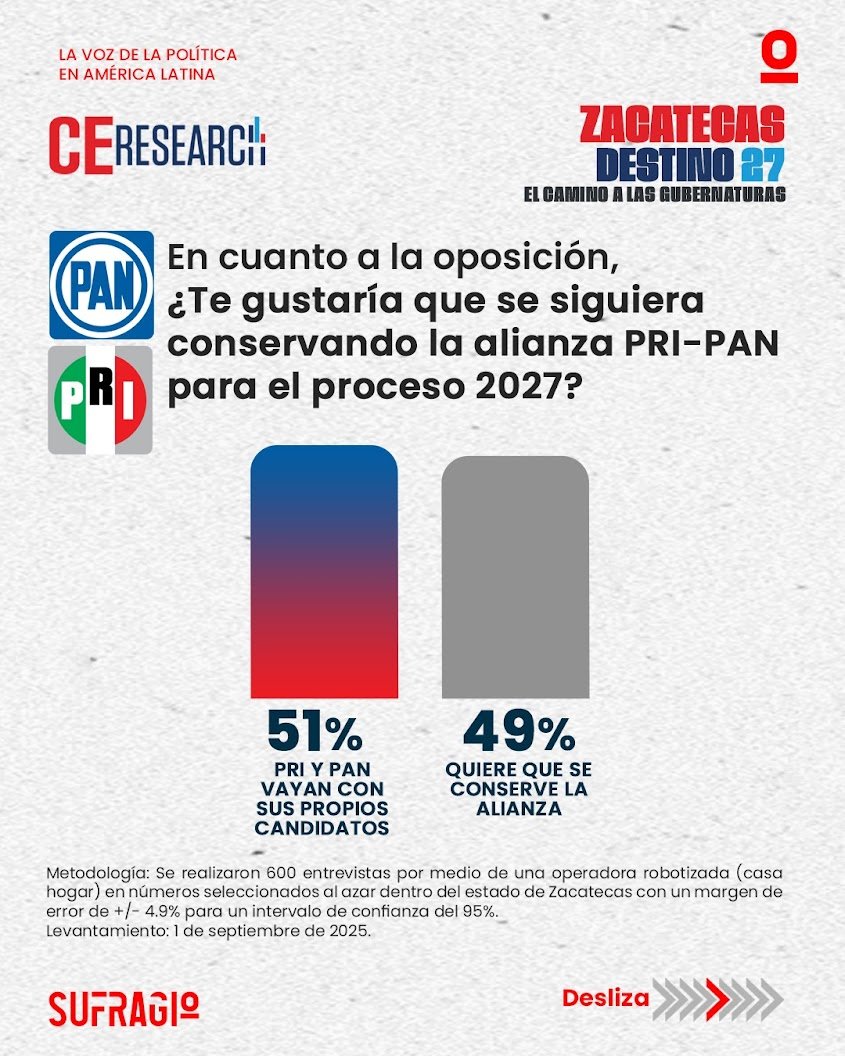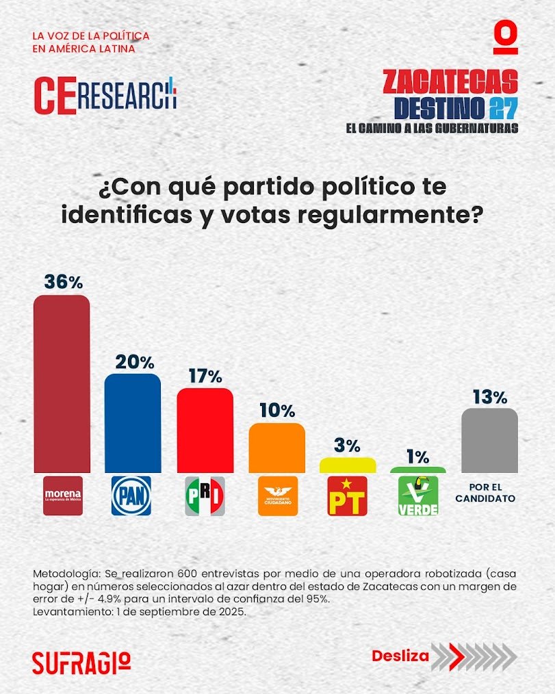 CE Research presenta los resultados de su más reciente estudio sobre la intención de voto y las preferencias partidarias en Zacatecas, de cara al proceso electoral para la gubernatura. La encuesta analiza la identificación política de la población, las preferencias de los ciudadanos sobre candidatos de Morena y sus aliados, así como de los partidos de oposición como PAN, PRI y Movimiento Ciudadano. También aborda la opinión sobre la continuidad de la alianza PRI-PAN y las inclinaciones de voto si la elección se realizara hoy, mostrando un panorama preliminar de las tendencias políticas en la entidad.