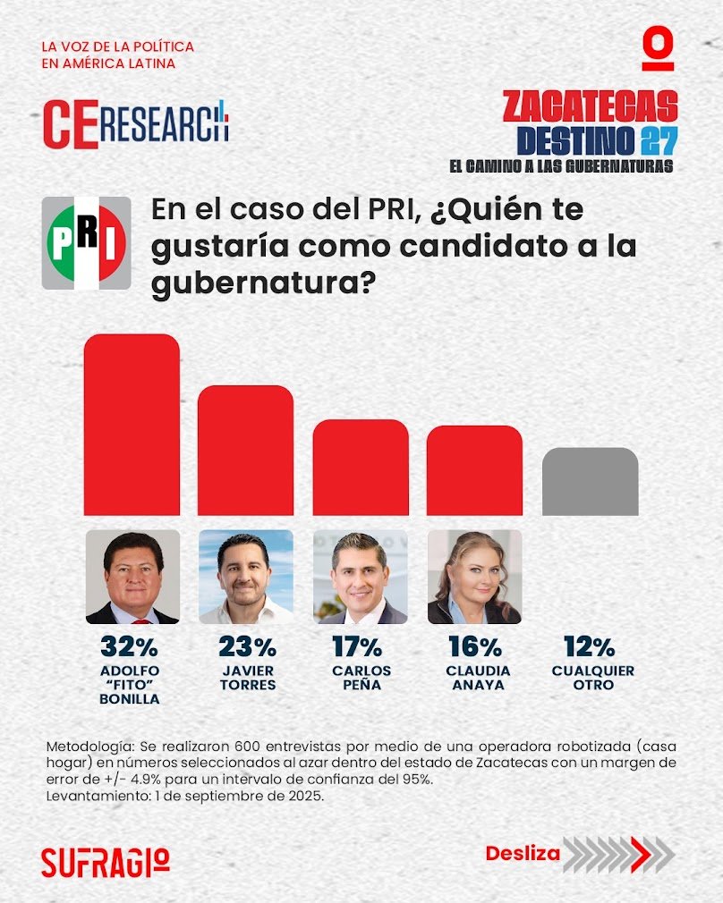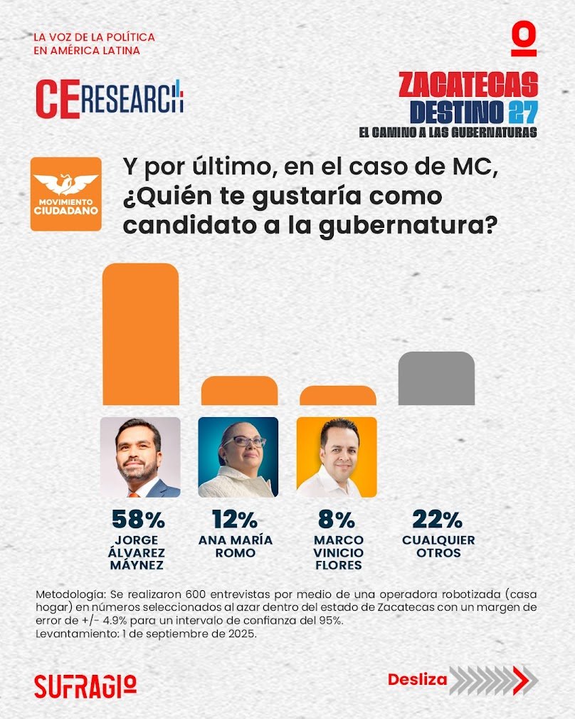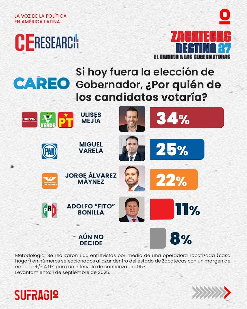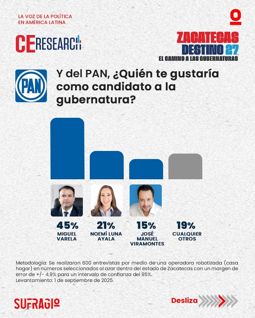 CE Research presenta los resultados de su más reciente estudio sobre la intención de voto y las preferencias partidarias en Zacatecas, de cara al proceso electoral para la gubernatura. La encuesta analiza la identificación política de la población, las preferencias de los ciudadanos sobre candidatos de Morena y sus aliados, así como de los partidos de oposición como PAN, PRI y Movimiento Ciudadano. También aborda la opinión sobre la continuidad de la alianza PRI-PAN y las inclinaciones de voto si la elección se realizara hoy, mostrando un panorama preliminar de las tendencias políticas en la entidad.