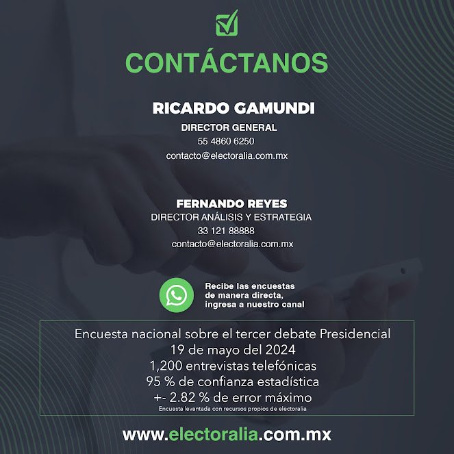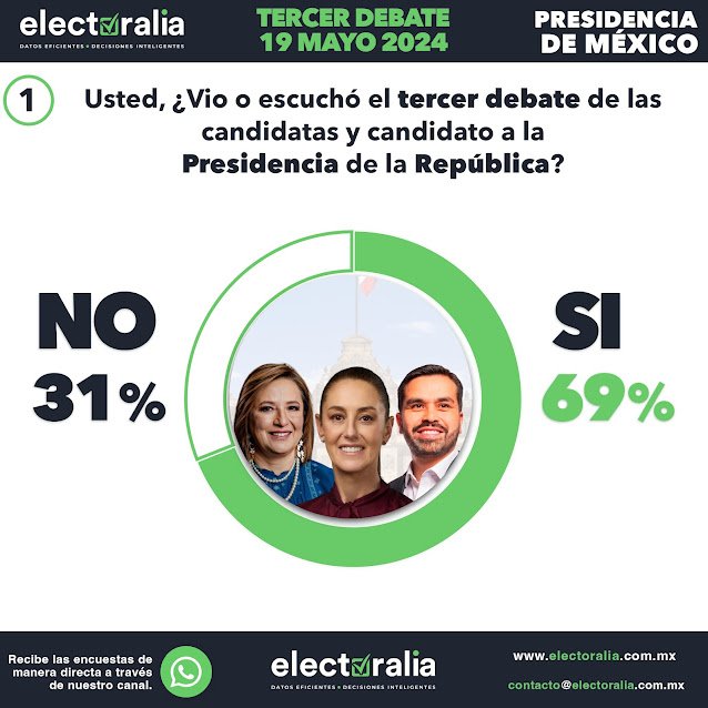 Tras el tercer debate previo a las elecciones, Electoralia llevó a cabo una encuesta para conocer la percepción de los votantes, arrojando que Claudia Sheinbaum lidera los resultados con un 57% de los votos del electorado, seguido por Xóchitl Gálvez con 26% y Jorge Álvarez Maýnez con 17% de preferencia.