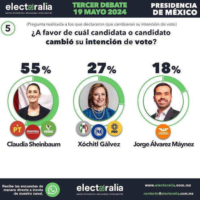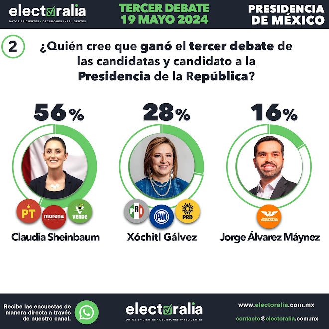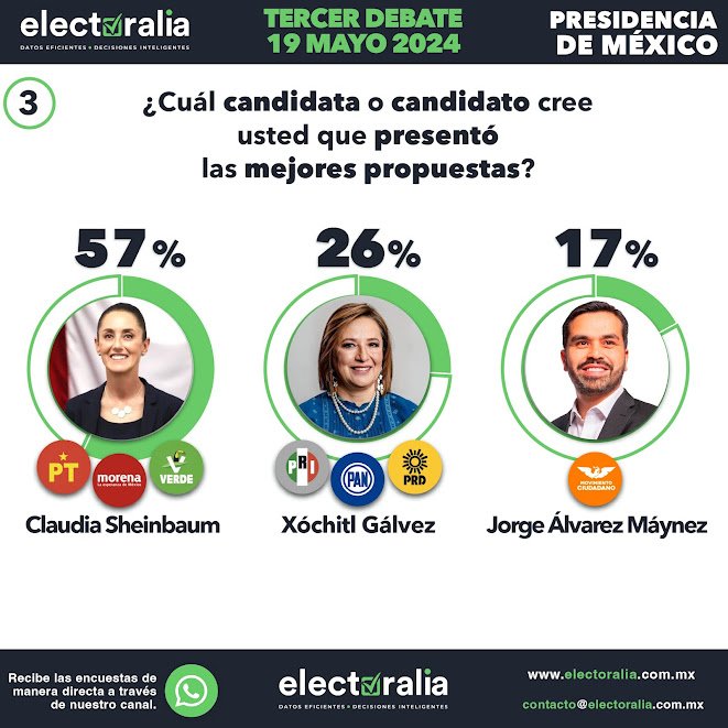 México Tras el tercer debate previo a las elecciones, Electoralia llevó a cabo una encuesta para conocer la percepción de los votantes, arrojando que Claudia Sheinbaum lidera los resultados con un 57% de los votos del electorado, seguido por Xóchitl Gálvez con 26% y Jorge Álvarez Maýnez con 17% de preferencia. Fuente: Electoralia