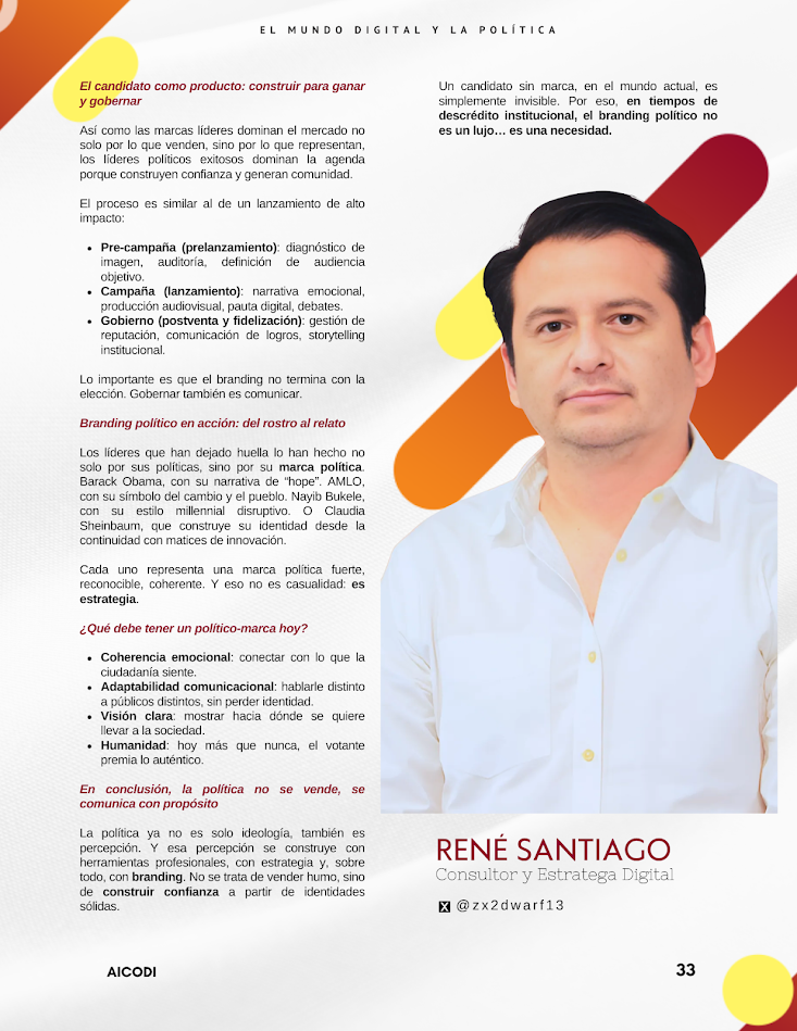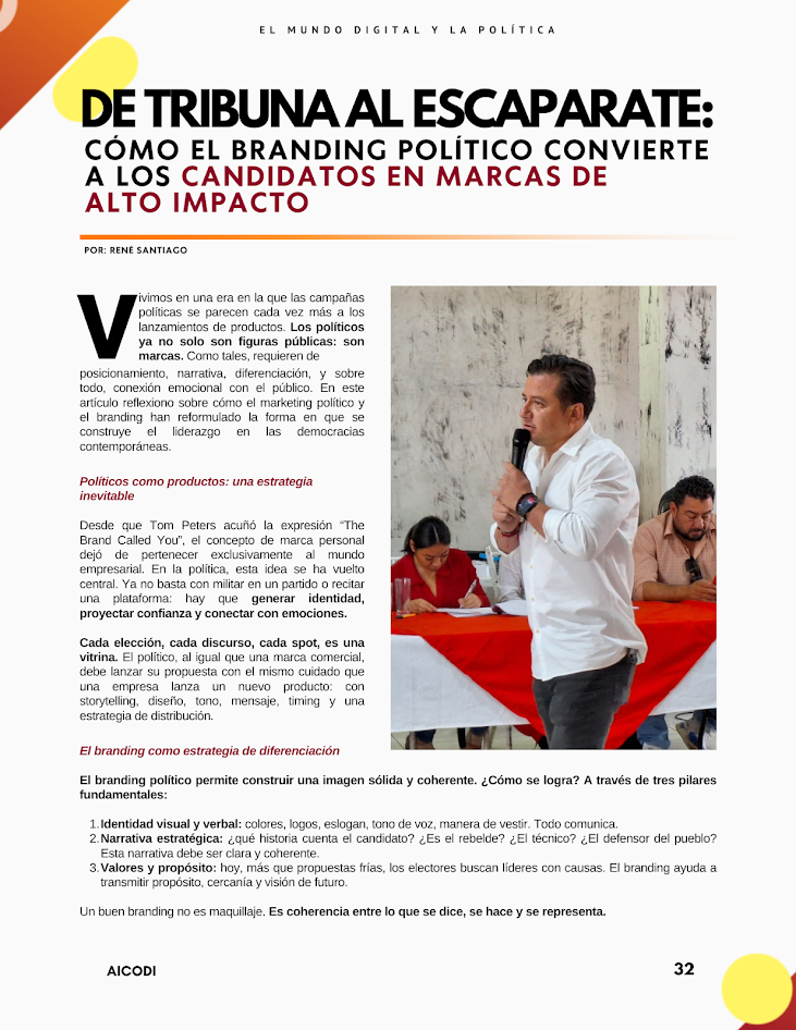 📰 De Tribuna al Escaparate: Cómo el Branding Político Convierte a los Candidatos en Marcas de Alto Impacto Por René SantiagoConsultor y Estratega digital Vivimos en una era en la que las campañas políticas se parecen cada vez más a los lanzamientos de productos. Los políticos ya no solo son figuras públicas: son marcas. Como tales, requieren de posicionamiento, narrativa, diferenciación, y sobre todo, conexión emocional con el público. En este artículo reflexiono sobre cómo el marketing político y el branding han reformulado la forma en que se construye el…