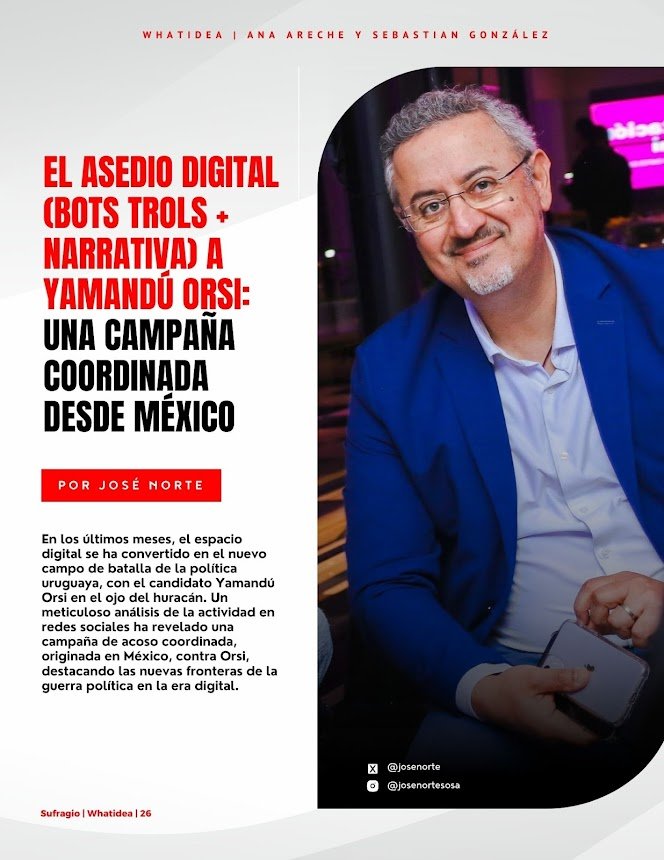 Por: José Norte Sosa Consultor en comunicación digital e inteligencia de datos. CEO de Reputación Digital Internacional En los últimos meses, el espacio digital se ha convertido en el nuevo campo de batalla de la política uruguaya, con el candidato Yamandú Orsi en el ojo del huracán. Un meticuloso análisis de la actividad en redes sociales ha revelado una campaña de acoso coordinada, originada en México, contra Orsi, destacando las nuevas fronteras de la guerra política en la era digital. El 7 de marzo, se desencadenó una serie de…