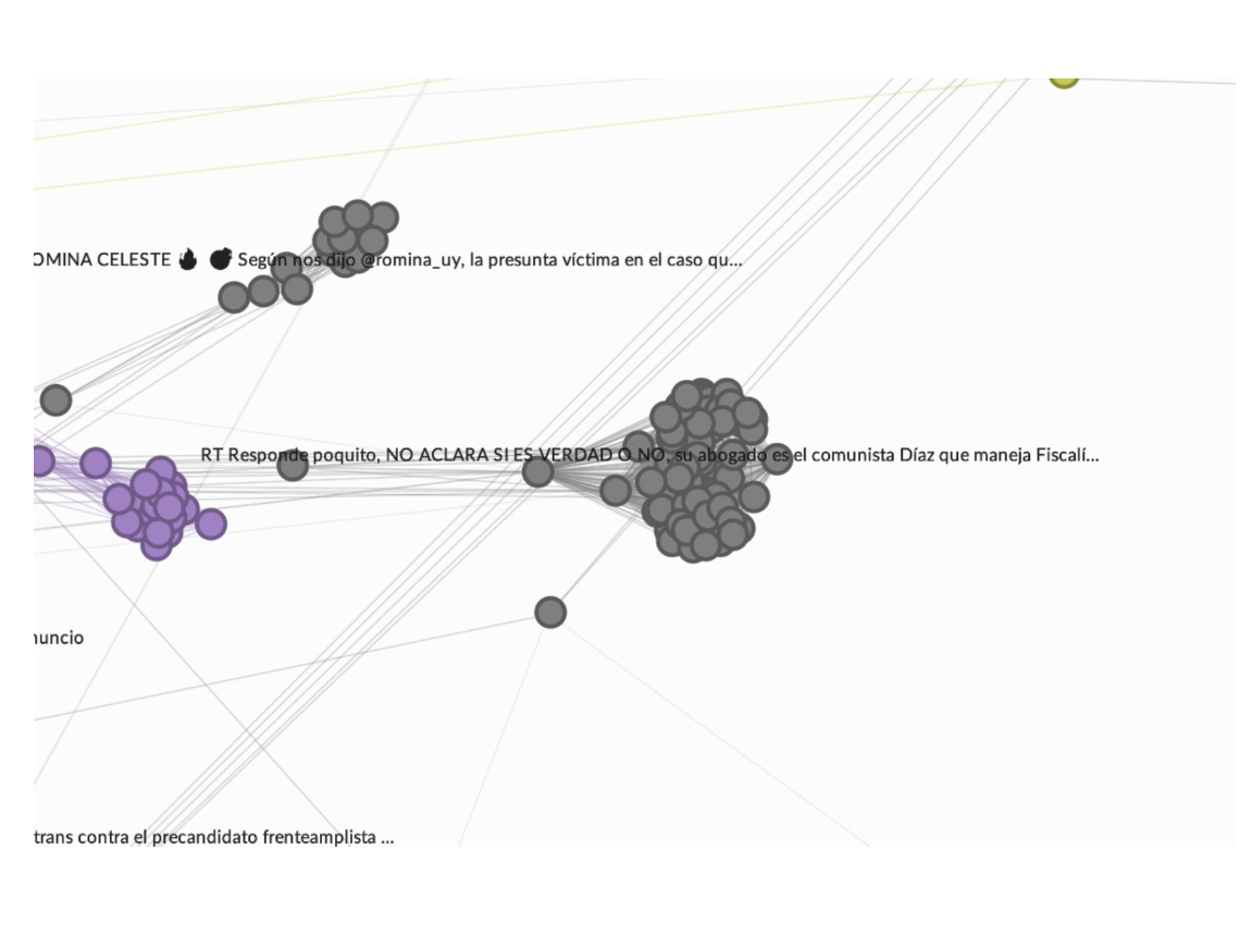 Aunque el tema se instaló en la opinión pública, principalmente promovido por los medios de comunicación, se han detectado infinidad de conversaciones que intentaron por su parte instalar el tema en redes sociales especialmente en X (Twitter). Aparecen en Gris en los clústers generales. En otras palabras hablan entre ellos mismos arrobando al candidato o instalando un hashtag o haciendo RT