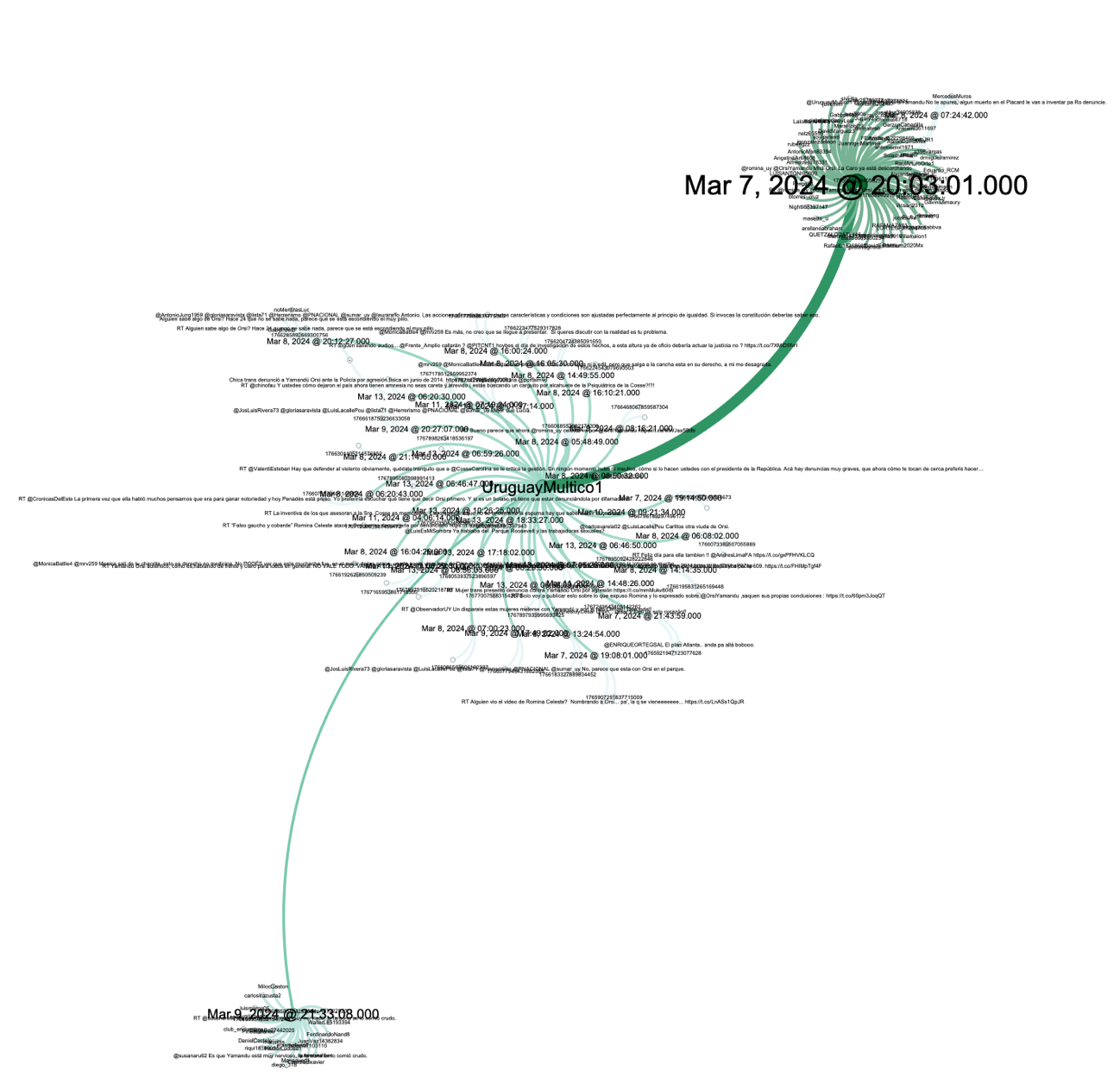 Los gráficos incluidos en el análisis muestran claramente cómo las publicaciones originales, emitidas por cuentas uruguayas, fueron rápidamente retomadas y amplificadas por usuarios mexicanos. Esta estrategia de “echo chamber” o cámara de eco, donde el mismo mensaje es replicado una y otra vez, amplifica artificialmente su relevancia y visibilidad.