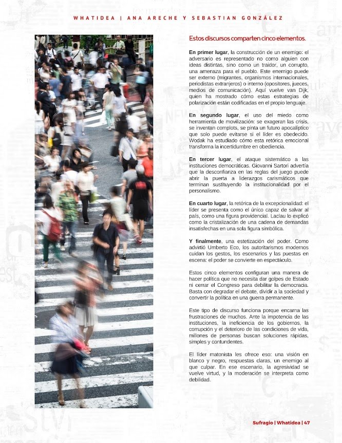 Estos cinco elementos configuran una manera de hacer política que no necesita dar golpes de Estado ni cerrar el Congreso para debilitar la democracia. Basta con degradar el debate, dividir a la sociedad y convertir la política en una guerra permanente.