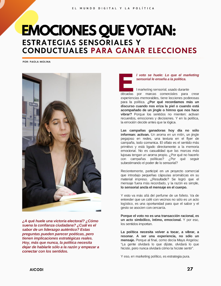 Emociones que votan: estrategias sensoriales y conductuales para ganar elecciones. Por: Paola Molina ¿A qué huele una victoria electoral? ¿Cómo suena la confianza ciudadana? ¿Cuál es el sabor de un liderazgo auténtico? Estas preguntas pueden parecer poéticas, pero tienen implicaciones estratégicas reales. Hoy, más que nunca, la política necesita dejar de hablarle sólo a la razón y empezar a conectar con los sentidos. El voto se huele: Lo que el marketing sensorial le enseña a la política.El marketing sensorial, usado durante décadas por marcas comerciales para crear experiencias memorables, tiene…