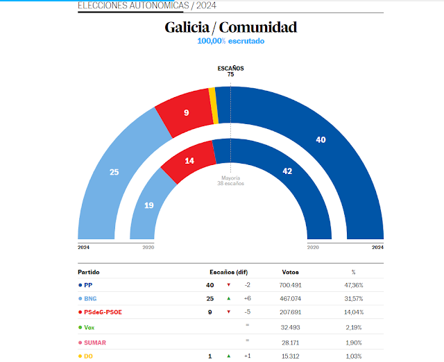 El Partido Popular ha revalidado la mayoría absoluta en el Parlamento de Galicia. El popular Alfonso Rueda ha conseguido 40 escaños, dos menos que en 2020, pero suficientes para seguir gobernando tras 15 años ininterrumpidos. En su primer mensaje tras la victoria electoral, Rueda ha usado los resultados para cargar contra el Gobierno de Pedro Sánchez. “Hoy Galicia le mandó un mensaje a Sánchez: aquí no queremos chantajes”, ha dicho el presidente de la Xunta. El BNG de Ana Pontón obtiene el mejor resultado de su historia y sube seis escaños, hasta los 25 diputados, lo que consolida al Bloque como segunda fuerza. Esto les sitúa como “el referente indiscutible como alternativa al PP”, ha dicho Pontón en su valoración de la noche electoral. El PSdeG se hunde con nueve escaños, su peor resultado. “La ciudadanía gallega nos ha situado en la oposición”, ha admitido José Ramón Gómez Besteiro. Democracia Ourensana se estrena en el Parlamento con un representante. La candidata de Sumar, Marta Lois, ha reconocido que sus resultados, que les dejan fuera del Parlamento, “son malos, sin paliativos”. Tampoco han entrado en la Cámara Vox ni Podemos.