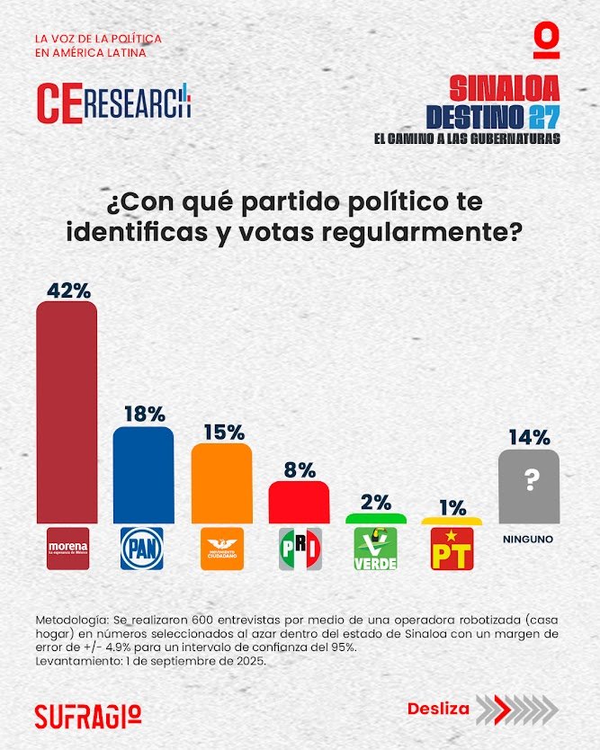 La más reciente encuesta de CE-Research, levantada el 2 de septiembre de 2025, ofrece un panorama sobre cómo se están configurando las preferencias políticas en Sinaloa rumbo a la elección de 2027. El estudio mide la identificación partidista de la ciudadanía, las figuras mejor posicionadas dentro de Morena y sus aliados, así como las opciones que se perfilan en la oposición, incluyendo la permanencia de la alianza PAN-PRI. Además, se exploran los escenarios de intención de voto y las percepciones sobre posibles candidaturas, trazando un adelanto de cómo podría configurarse la contienda electoral en los próximos años.