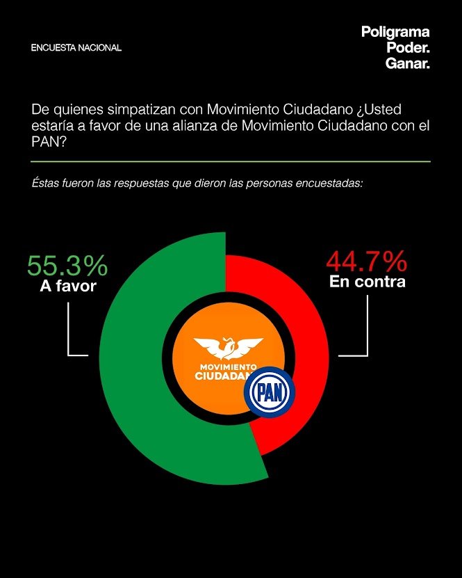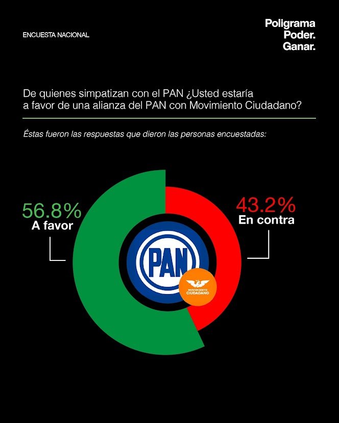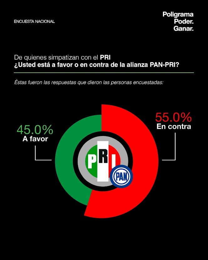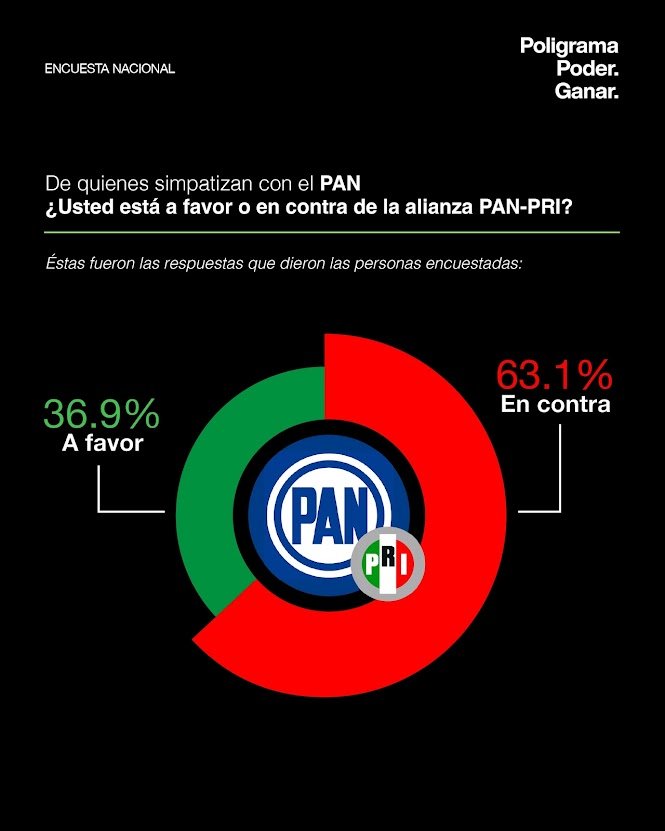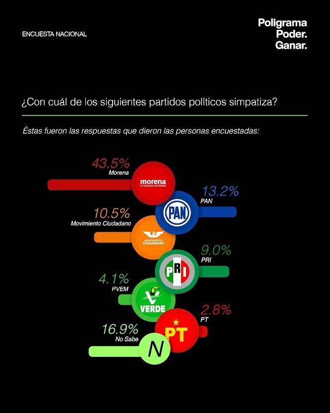 Según la encuesta nacional de Poligrama realizada en julio de 2025, Morena se mantiene como el partido con mayor simpatía ciudadana con un 43.5%, seguido por el PAN con 13.2% y Movimiento Ciudadano con 10.5%. El PRI alcanza solo el 9%. Además, el estudio revela que una mayoría de simpatizantes del PAN (63.1%) y del PRI (55%) rechazan la alianza entre ambos partidos. En contraste, más del 55% de quienes apoyan al PAN o a Movimiento Ciudadano están a favor de una posible coalición entre estas dos fuerzas políticas, lo que indica un mayor potencial de entendimiento entre ellas que con el PRI.