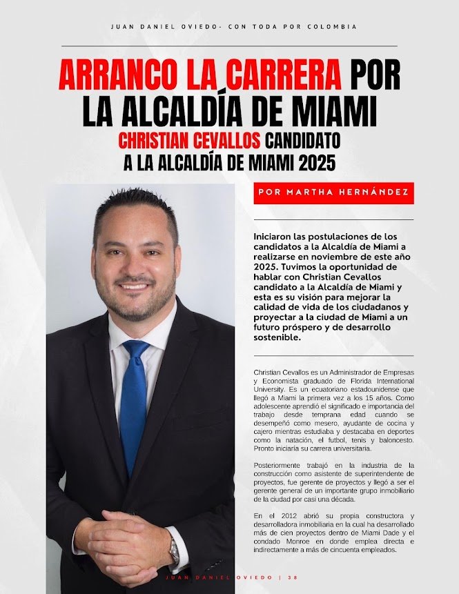 Por Martha Hernández Iniciaron las postulaciones de los candidatos a la Alcaldía de Miami a realizarse en noviembre de este año 2025. Tuvimos la oportunidad de hablar con Christian Cevallos candidato a la Alcaldía de Miami y esta es su visión para mejorar la calidad de vida de los ciudadanos y proyectar a la ciudad de Miami a un futuro próspero y de desarrollo sostenible. Christian Cevallos es un Administrador de Empresas y Economista graduado de Florida International University. Es un ecuatoriano estadounidense que llegó a Miami la primera…