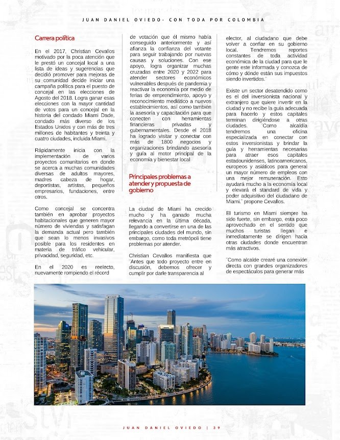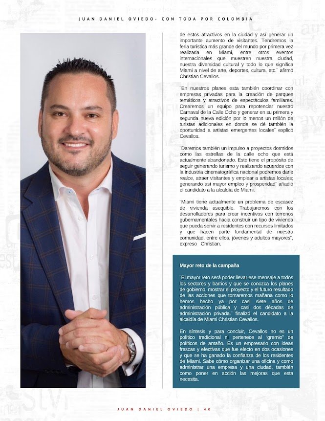 En síntesis y para concluir, Cevallos no es un político tradicional ni pertenece al “gremio” de políticos de antaño. Es un empresario con ideas frescas y efectivas que fue electo en dos ocasiones y que se ha ganado la confianza de los residentes de Miami. Sabe cómo organizar una oficina y como administrar una empresa y una ciudad, también como poner en acción las mejoras que esta necesita.