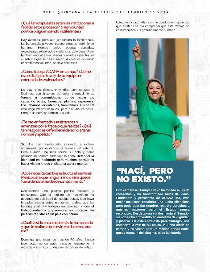 Con esta frase, Tannya Bravo ha tocado miles de corazones y ha transformado miles de vidas. Fundadora y presidenta de ADANA MX, esta mujer mexicana encabeza una lucha silenciosa pero poderosa: dar nombre, rostro y derechos a quienes nacieron pero el Estado nunca reconoció. Desde zonas rurales hasta el Senado, su voz se ha convertido en emblema de dignidad y justicia. En esta entrevista para Sufragio, nos comparte la raíz de su causa, la lucha diaria en campo y su visión para un México donde nadie quede fuera, ni del sistema, ni de la historia.