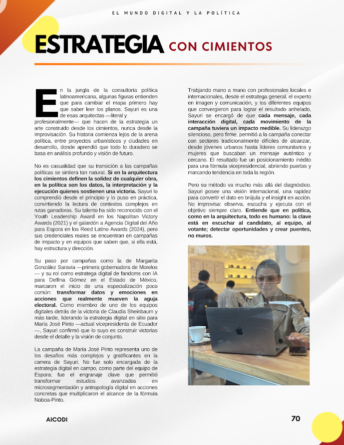 Su paso por campañas como la de Margarita González Saravia —primera gobernadora de Morelos— y su rol como estratega digital de fandoms con IA para Delfina Gómez en el Estado de México, marcaron el inicio de una especialización poco común: transformar datos y emociones en acciones que realmente mueven la aguja electoral. Como miembro del equipo detrás de la victoria de Claudia Sheinbaum y más tarde, liderando la estrategia digital en sitio para María José Pinto —actual vicepresidenta de Ecuador—, Sayuri confirmó que lo suyo es construir victorias desde el detalle y la visión de conjunto.
