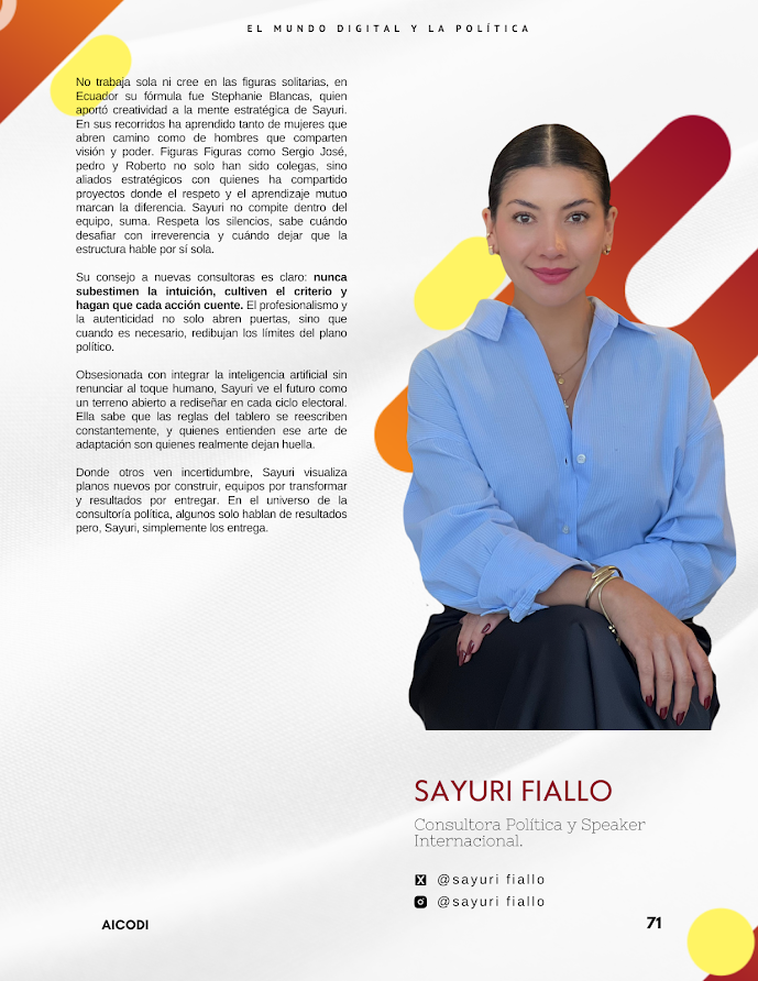 Estrategia con cimientos Por: Sayuri Fiallo En la jungla de la consultoría política latinoamericana, algunas figuras entienden que para cambiar el mapa primero hay que saber leer los planos. Sayuri es una de esas arquitectas —literal y profesionalmente— que hacen de la estrategia un arte construido desde los cimientos, nunca desde la improvisación. Su historia comienza lejos de la arena política, entre proyectos urbanísticos y ciudades en desarrollo, donde aprendió que todo lo duradero se basa en análisis profundo y visión de futuro. No es casualidad que su transición a…