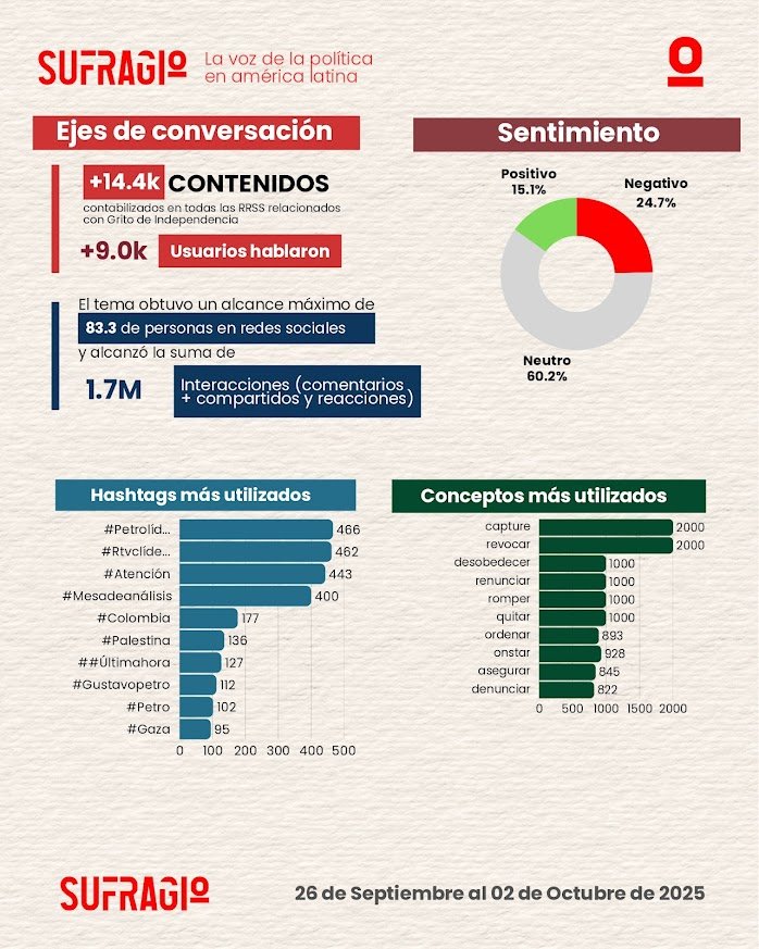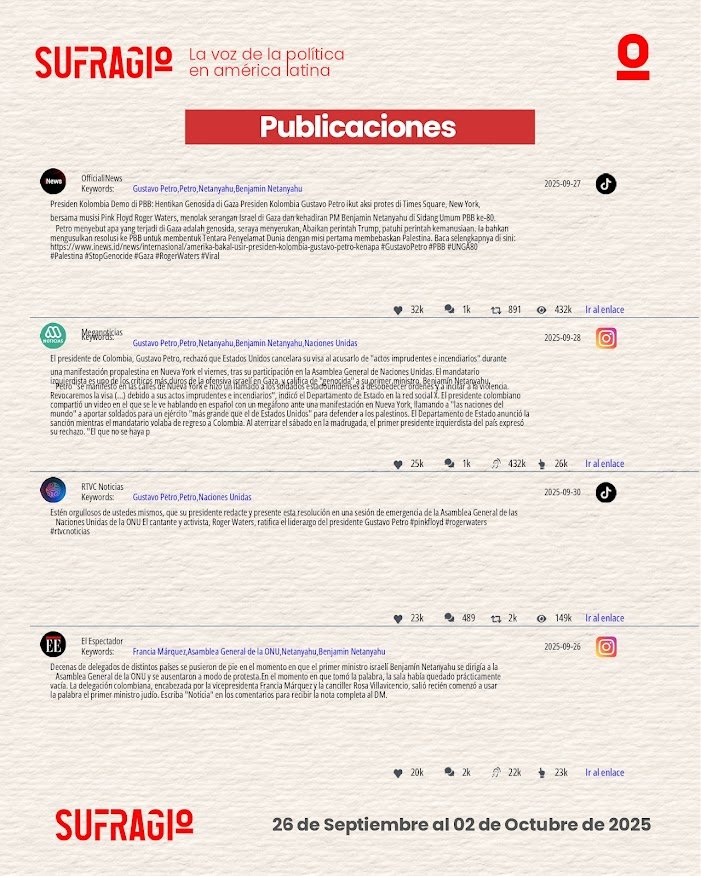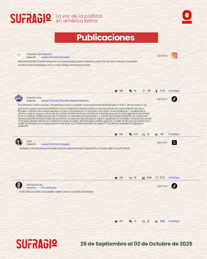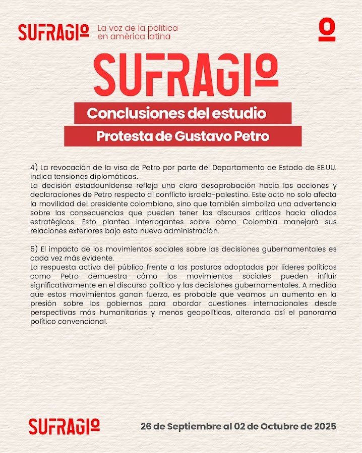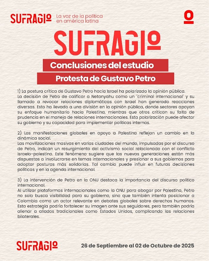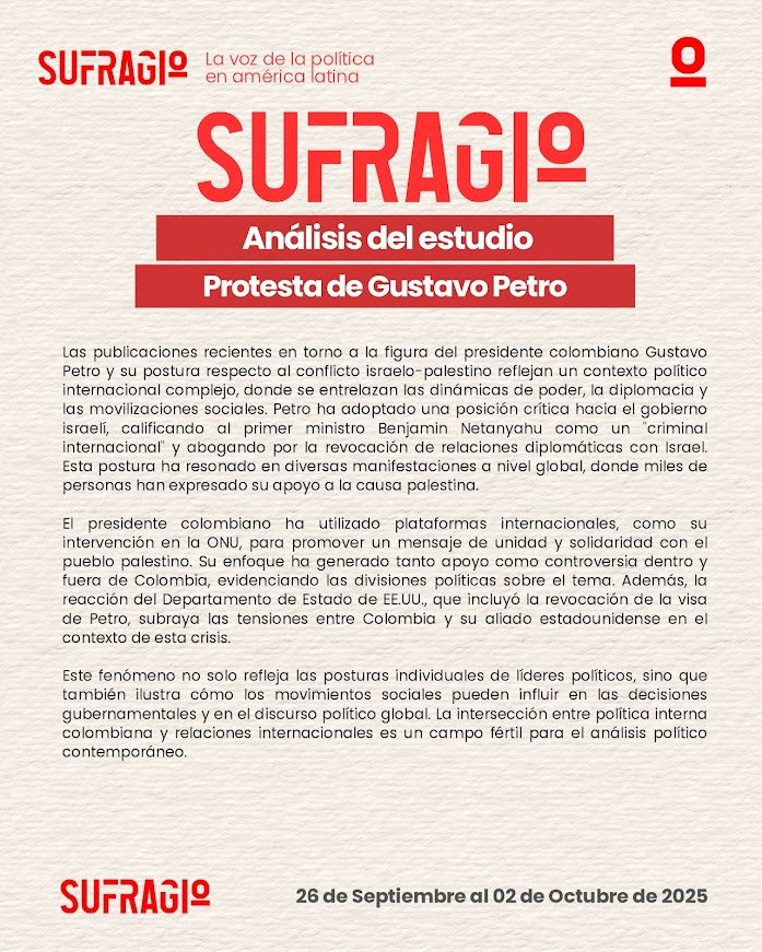 Estudio de Escucha Social: Protesta de Gustavo Petro Las recientes declaraciones del presidente colombiano Gustavo Petro sobre el conflicto israelo-palestino evidencian un contexto internacional complejo. Petro ha calificado al primer ministro israelí Benjamin Netanyahu como un “criminal internacional” y ha propuesto revocar las relaciones diplomáticas con Israel, generando repercusión global y apoyo a la causa palestina. Su intervención en la ONU y su postura han generado tanto respaldo como controversia, reflejando divisiones políticas internas y tensiones con Estados Unidos, que revocó su visa. Este episodio muestra cómo la política interna…