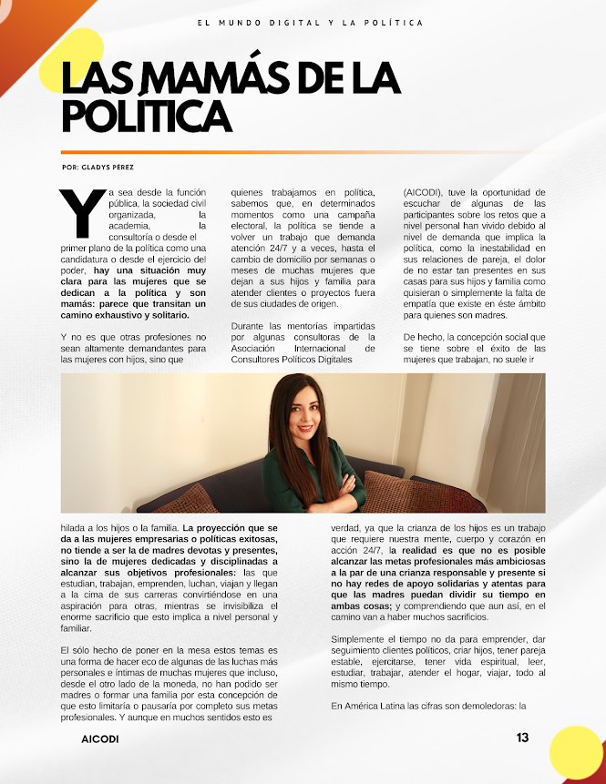 Durante las mentorías impartidas por algunas consultoras de la Asociación Internacional de Consultores Políticos Digitales (AICODI), tuve la oportunidad de escuchar de algunas de las participantes sobre los retos que a nivel personal han vivido debido al nivel de demanda que implica la política, como la inestabilidad en sus relaciones de pareja, el dolor de no estar tan presentes en sus casas para sus hijos y familia como quisieran o simplemente la falta de empatía que existe en éste ámbito para quienes son madres.