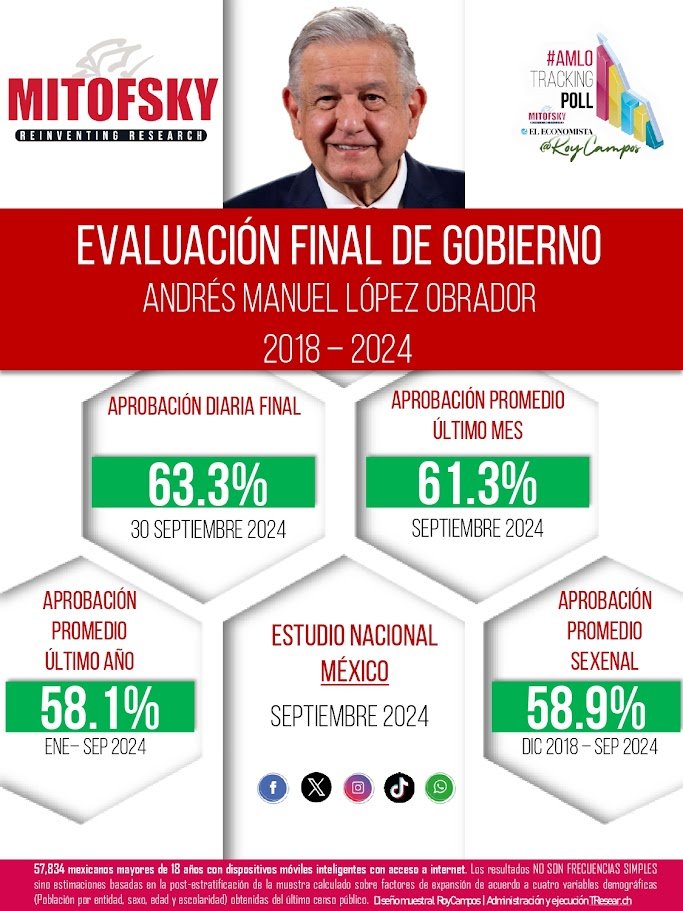 En un análisis exhaustivo sobre la popularidad de Andrés Manuel López Obrador al final de su presidencia, se revela que el mandatario mexicano termina su gestión con una aprobación del 63.3%. A lo largo de su último mes, la aprobación se mantiene en un promedio del 61.3%, mientras que su promedio durante todo su mandato es de 58.9%.