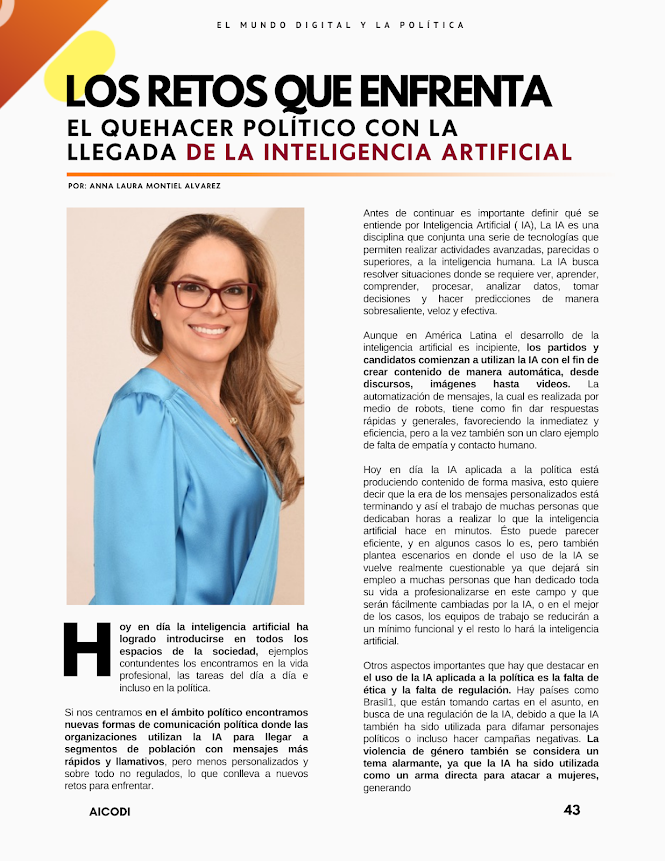 Por: Anna Laura Montiel Hoy en día la inteligencia artificial ha logrado introducirse en todos los espacios de la sociedad, ejemplos contundentes los encontramos en la vida profesional, las tareas del día a día e incluso en la política. Si nos centramos en el ámbito político encontramos nuevas formas de comunicación política donde las organizaciones utilizan la IA para llegar a segmentos de población con mensajes más rápidos y llamativos, pero menos personalizados y sobre todo no regulados, lo que conlleva a nuevos retos para enfrentar. Antes de continuar…
