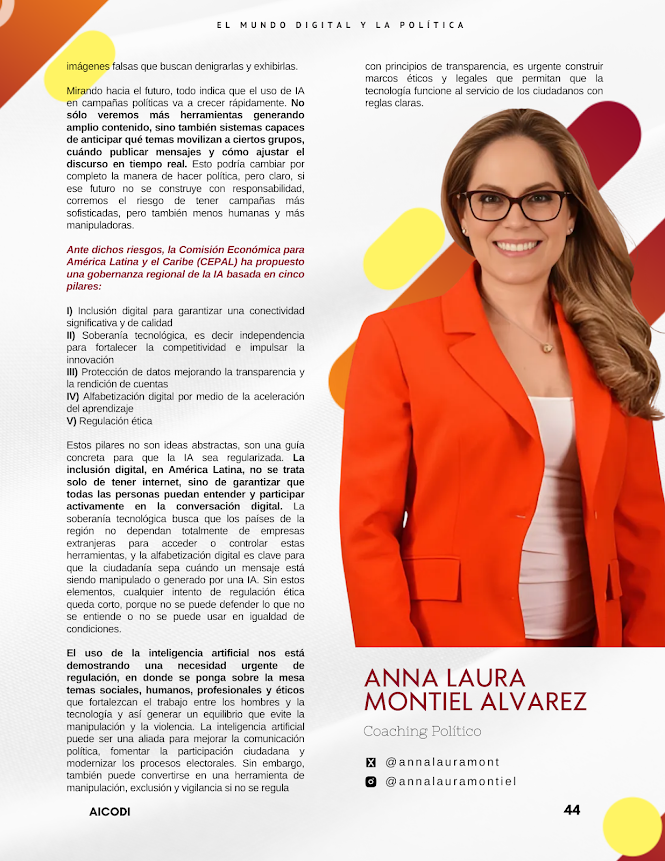 El uso de la inteligencia artificial nos está demostrando una necesidad urgente de regulación, en donde se ponga sobre la mesa temas sociales, humanos, profesionales y éticos que fortalezcan el trabajo entre los hombres y la tecnología y así generar un equilibrio que evite la manipulación y la violencia. La inteligencia artificial puede ser una aliada para mejorar la comunicación política, fomentar la participación ciudadana y modernizar los procesos electorales. Sin embargo, también puede convertirse en una herramienta de manipulación, exclusión y vigilancia si no se regula con principios de transparencia, es urgente construir marcos éticos y legales que permitan que la tecnología funcione al servicio de los ciudadanos con reglas claras.