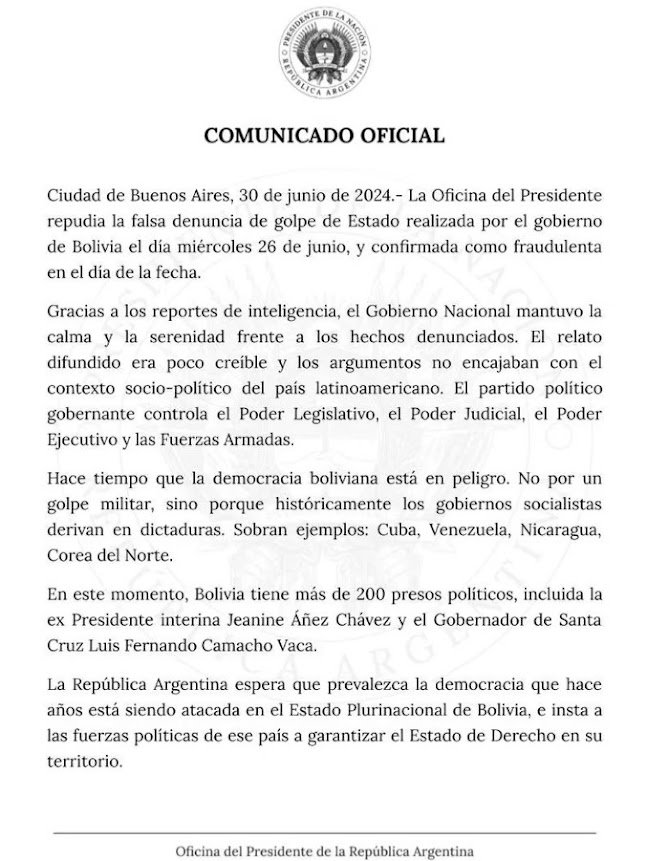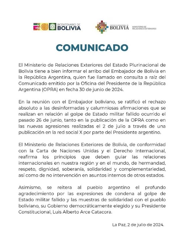 En respuesta a las tensiones diplomáticas, Bolivia llamó a consultas a su embajador en Argentina, Ramiro Tapia, considerando las declaraciones de Milei como “inamistosas y temerarias”. El gobierno boliviano reafirmó su rechazo a las acusaciones de negacionismo sobre el intento de golpe y agradeció el apoyo del pueblo argentino hacia su gobierno democráticamente electo.