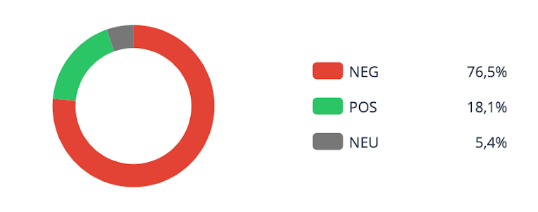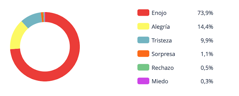 Emociones dominantes: el enojo arrasó con 73,9%, seguido por la alegría (14,4%) y la tristeza (9,9%). Sentimientos: más de tres cuartas partes de los mensajes fueron negativos (76,5%).
